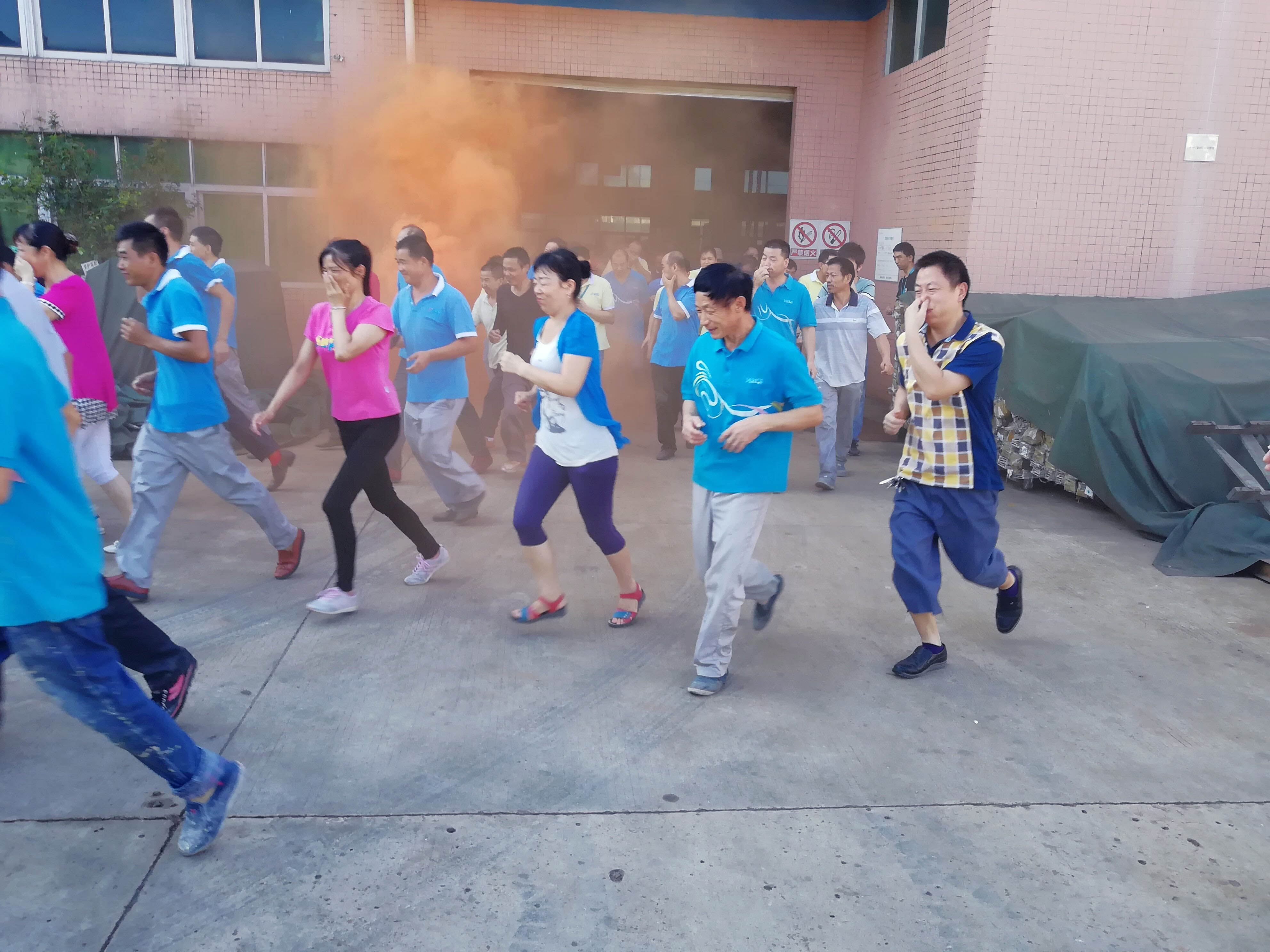 上午10點(diǎn),工廠火災(zāi)警報(bào)聲拉響,員工用濕毛巾掩住口鼻,彎腰伏背,按照既定的逃生路線,沿著樓梯,快速有序地撤離到工廠大院的安全地帶,并迅速整隊(duì)集合,按部門清點(diǎn)人數(shù),報(bào)告人數(shù),整個(gè)演練用時(shí)3分鐘,全廠員工全部安全撤離。