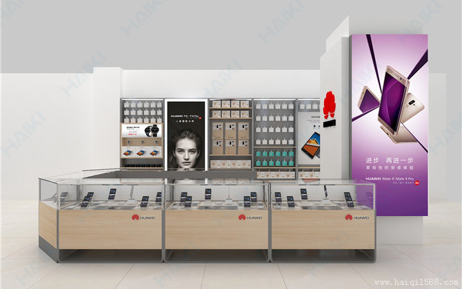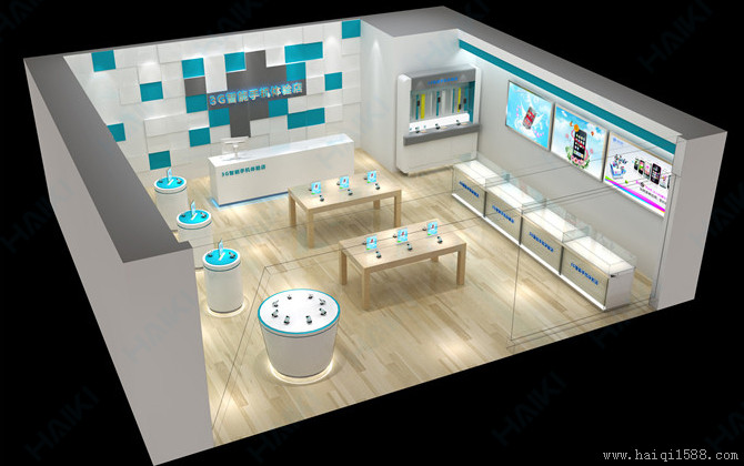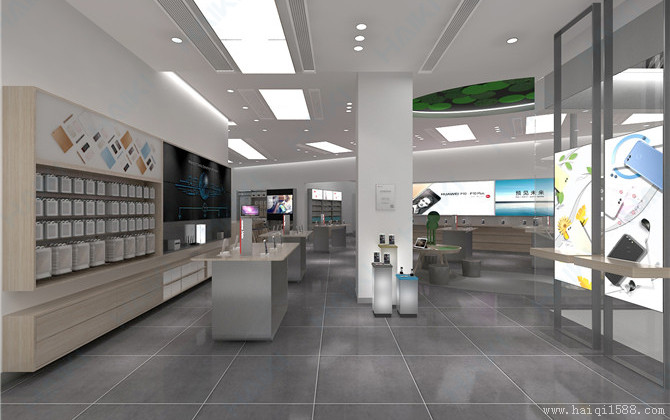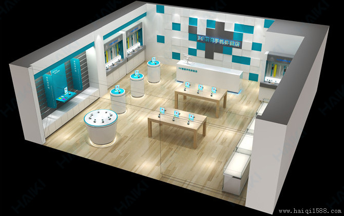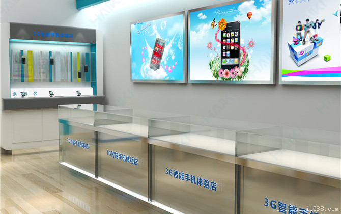 3G智能手機體驗店設(shè)計,將陳設(shè)藝術(shù)、生活功能等多種復(fù)雜元素的創(chuàng)造性融合,每一個區(qū)域、每一種物品都是整體環(huán)境的組成部分,柜臺與整體店面裝潢風(fēng)格保持一致,燈箱的精美畫面在空間陳設(shè)中發(fā)揮著不可替代的作用。